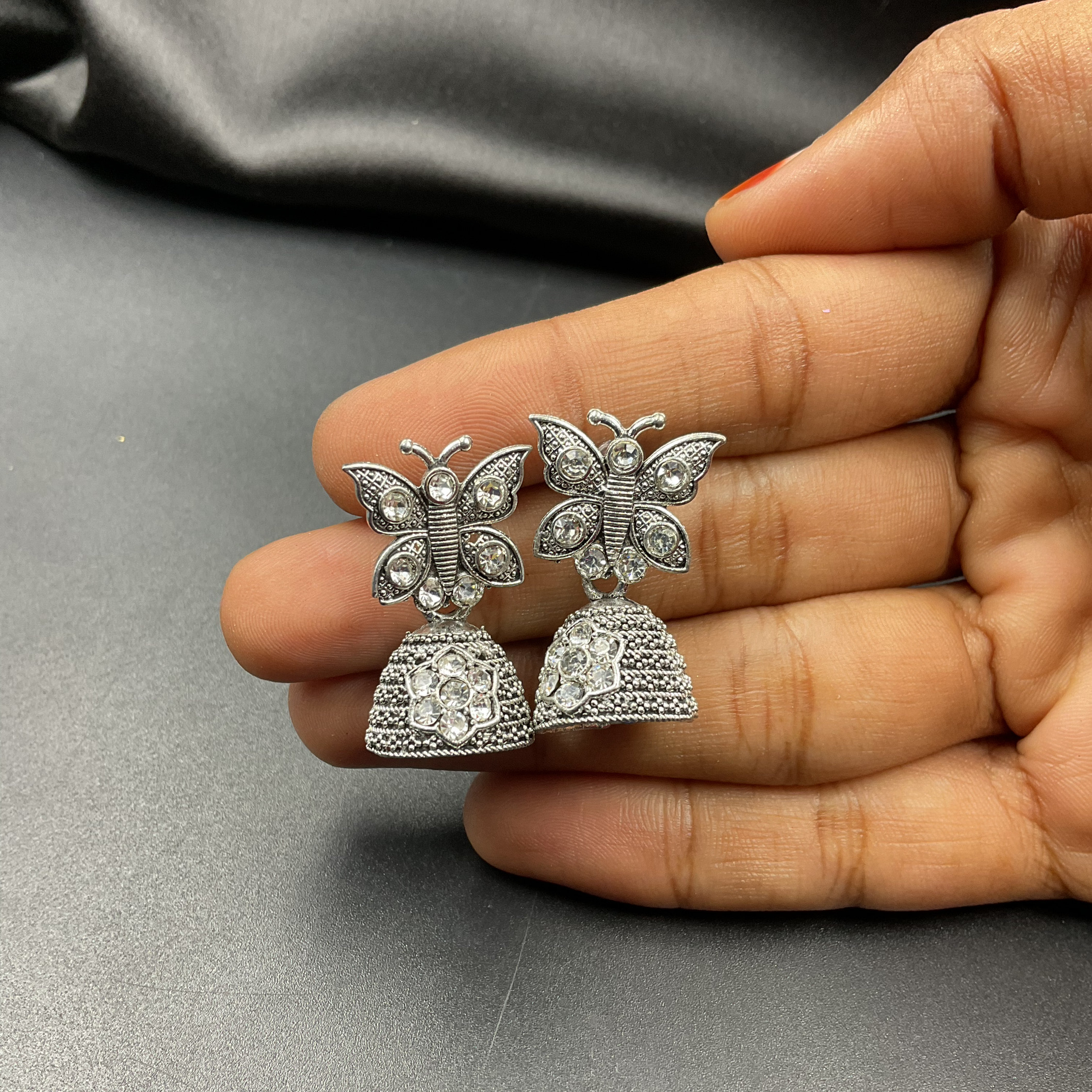 Silver Butterfly Flower Stone Jhumka